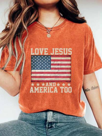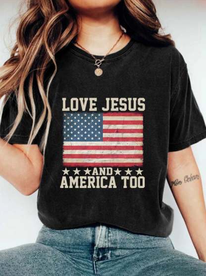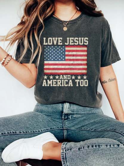 Women'S Casual Love Jesus And American Spirit Women'S Gift For Religious Friends Graphic Print Short Sleeve T-Shirt