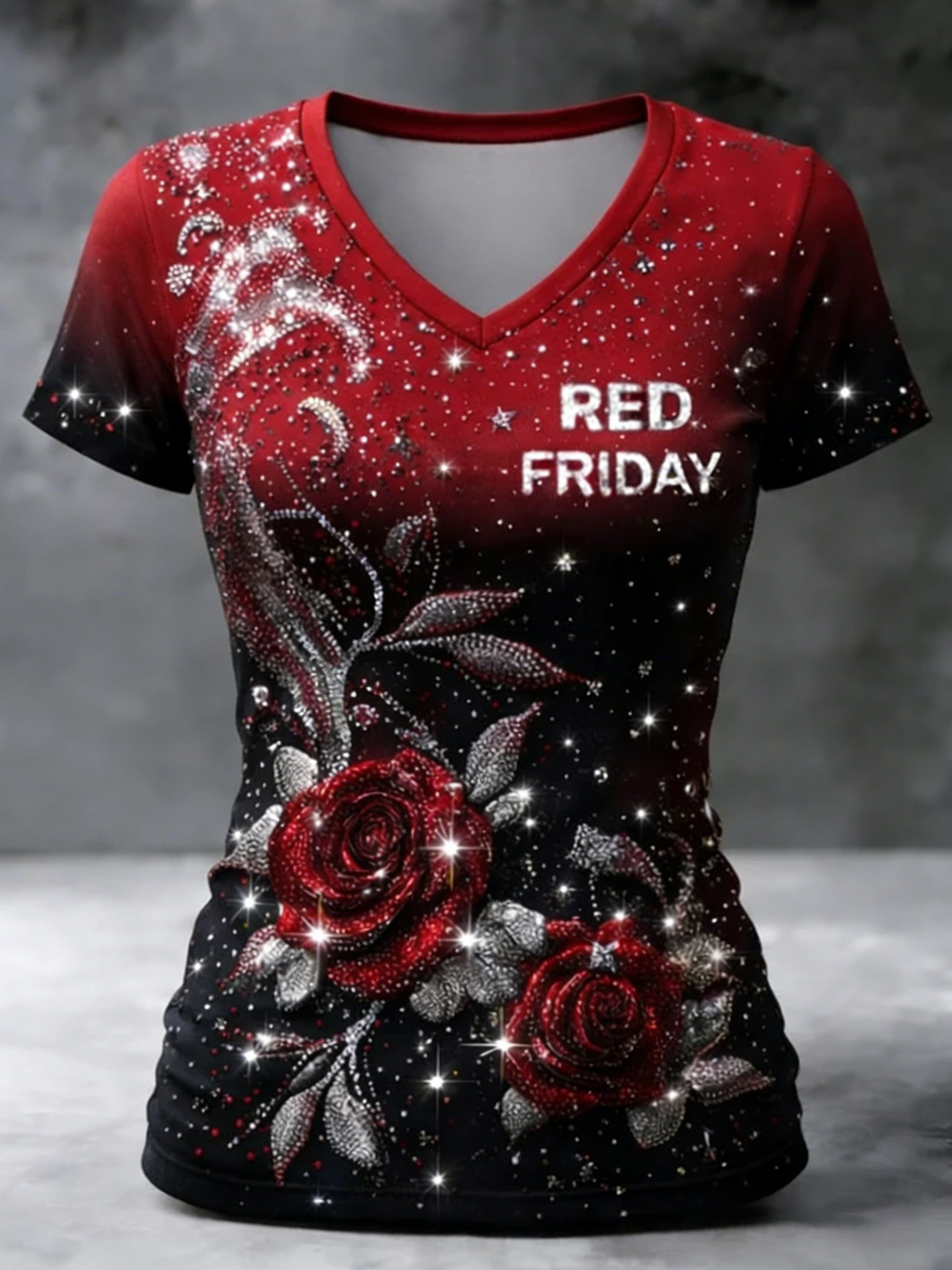 Women's Casual Red Friday Print Short-Sleeve T-Shirt