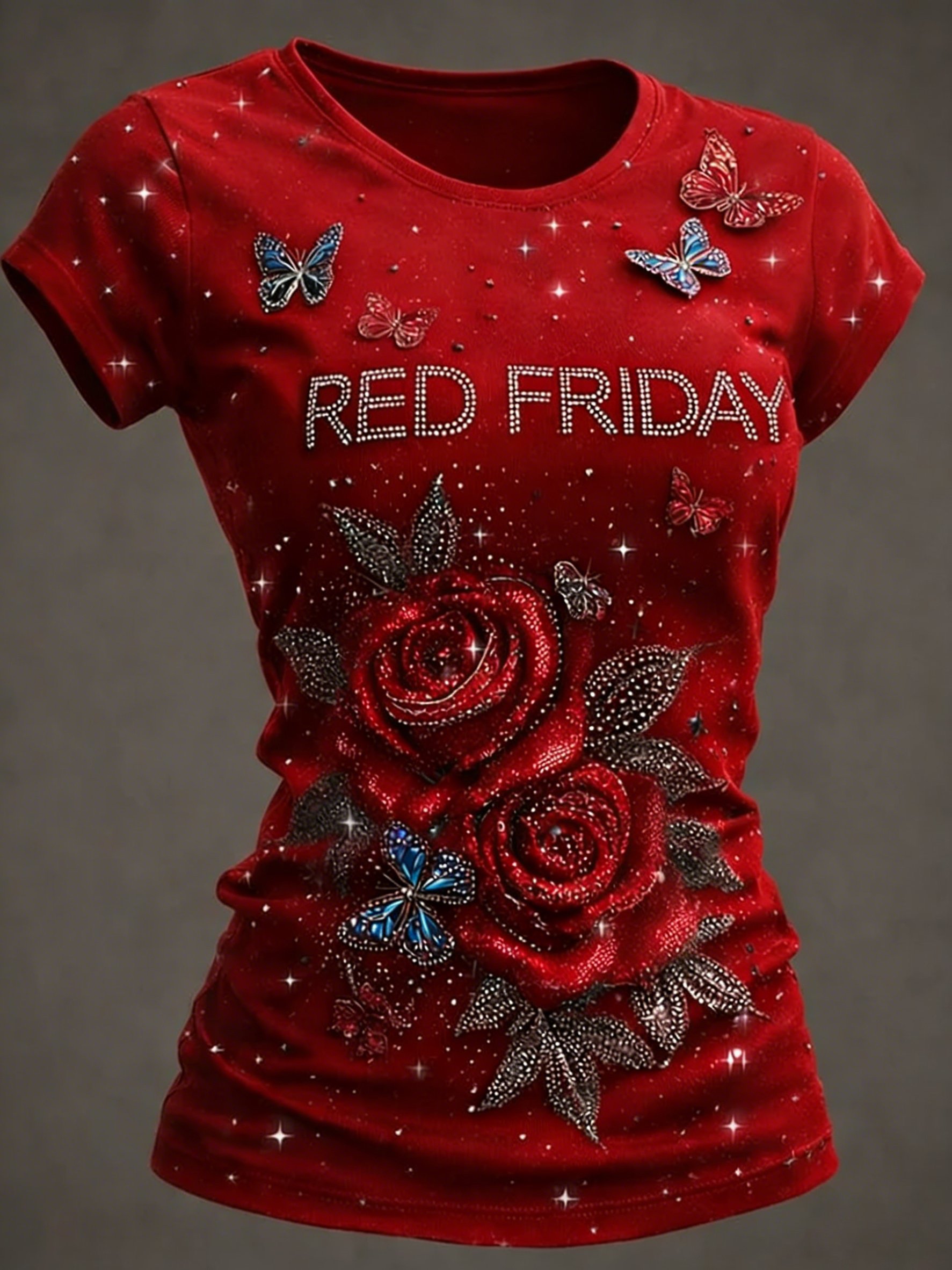 Women's Casual Red Friday Print Short-Sleeve T-Shirt