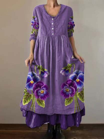 Women's Casual Retro Purple Floral Art Cotton Linen Dress