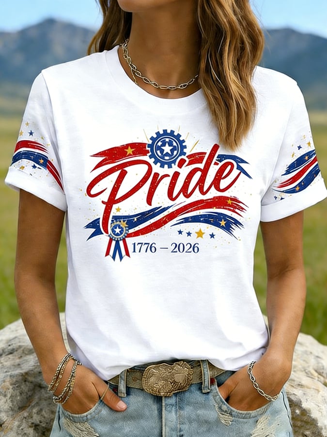 Women'S Casual Short-Sleeved T-Shirt With American 250th Anniversary Commemorative Print And Round Neckline.