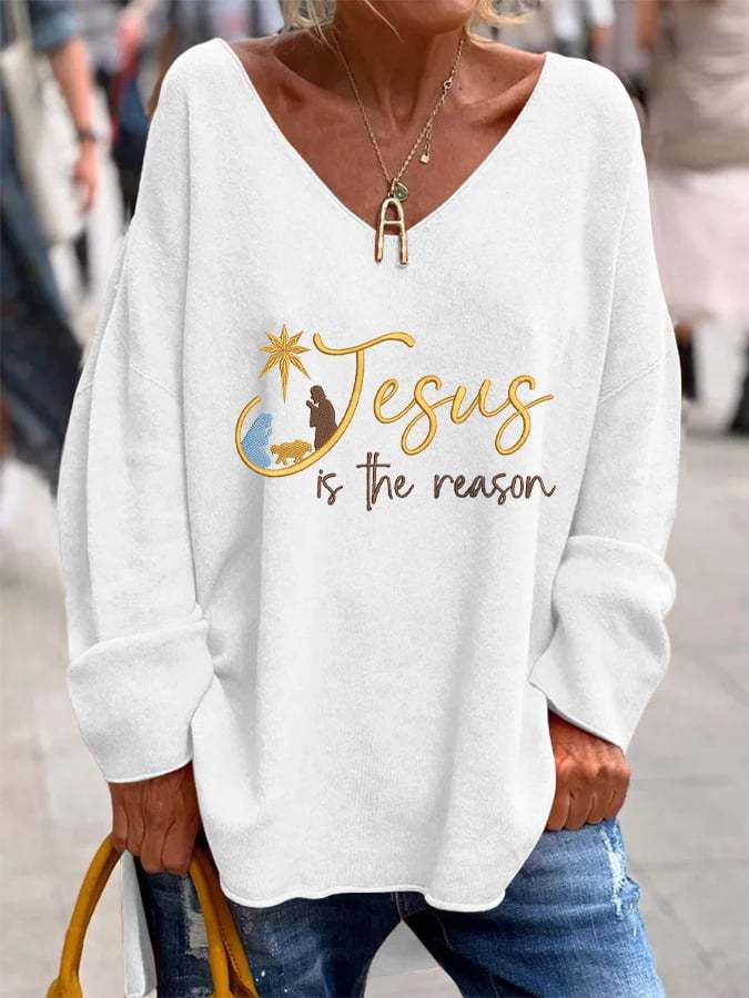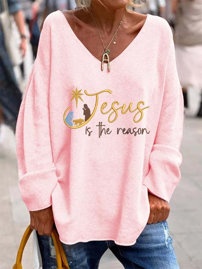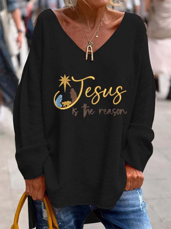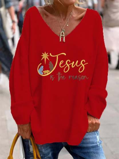 Women's Christmas Jesus Is The Reason Printed Casual V-Neck Top
