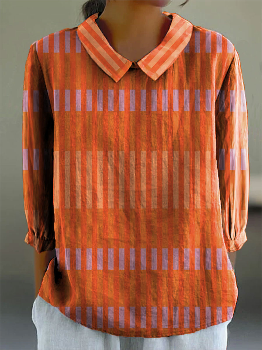 Women's Colorblock Striped Art Print Casual Cotton And Linen 3/4 Sleeve Shirt