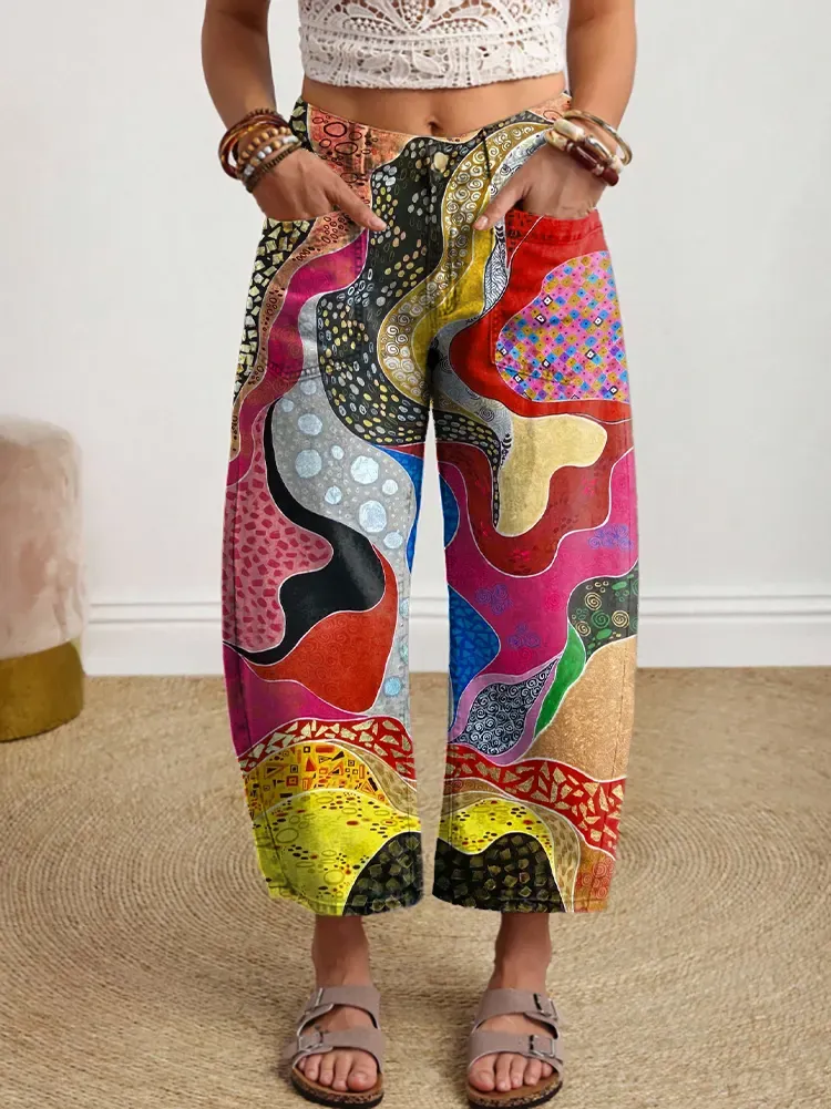 Women's Colorful Abstract Geometric Pattern Art Print Casual Cotton Trousers With Pockets.