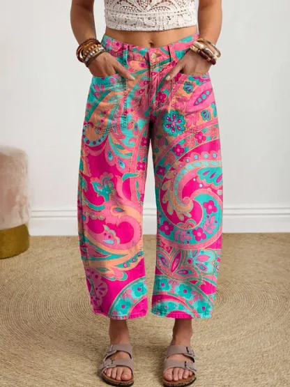 Women's Colorful Bohemian Paisley Art Print Casual Pocket Cotton Pants