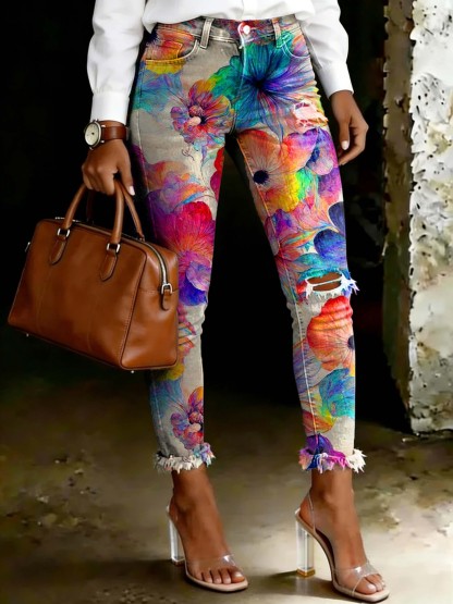 Women's Colorful Floral Print Ripped Skinny Jeans