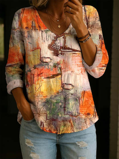 Women's Colorful Mottled Art Print Casual Cotton Shirt