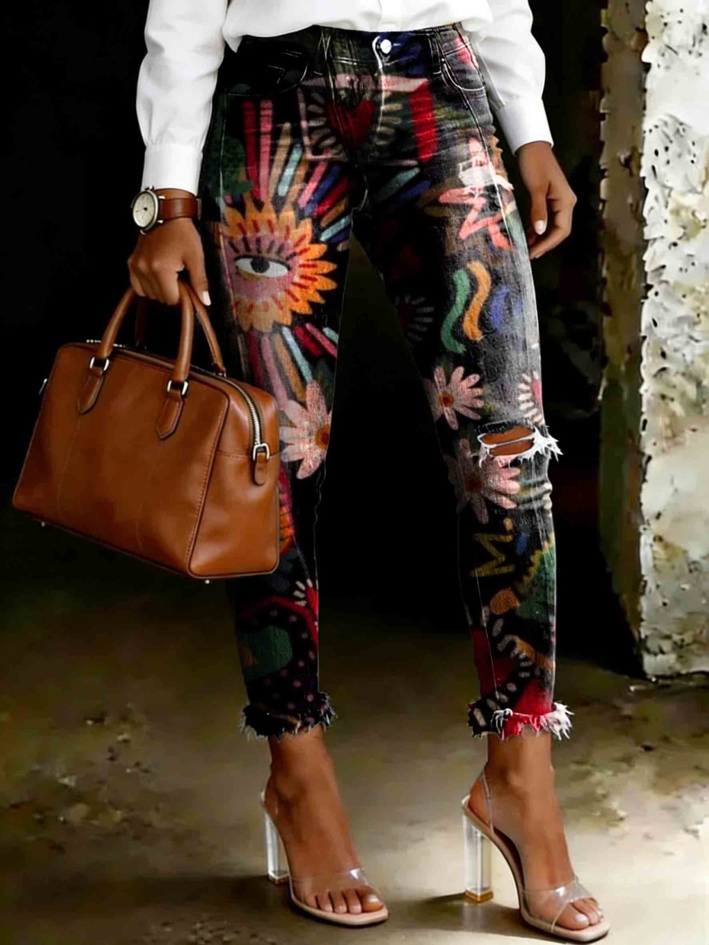 Women's Digital Printed Pants Leopard Print Art Ripped Skinny Jeans