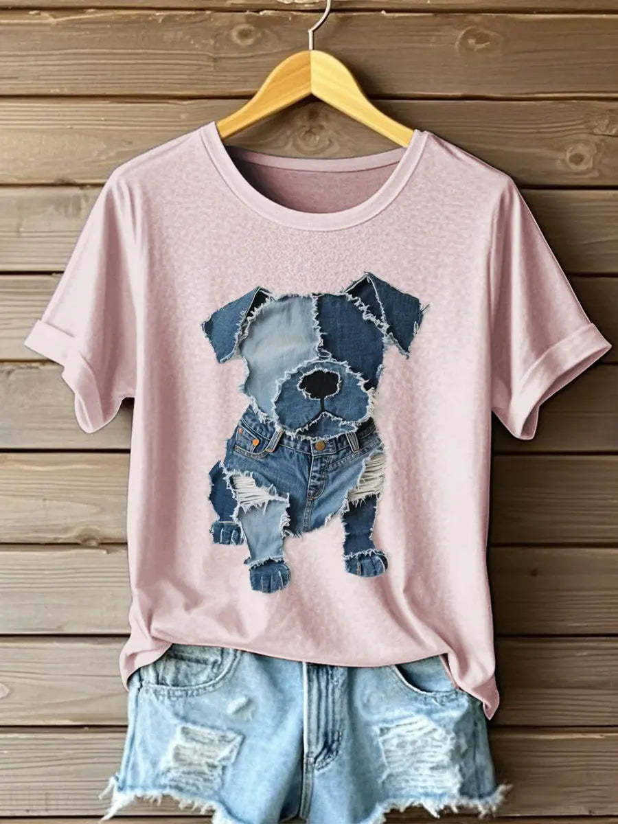 Women's Dog Pattern Denim Patchwork Art T-Shirt