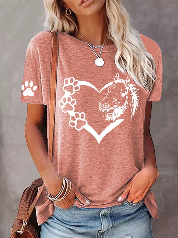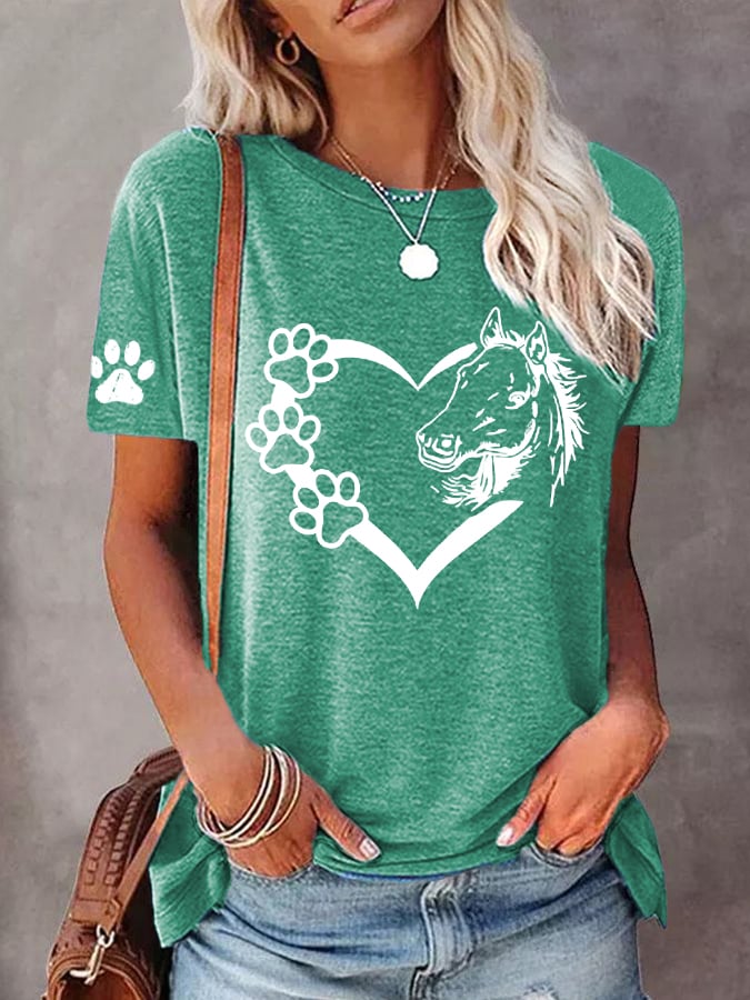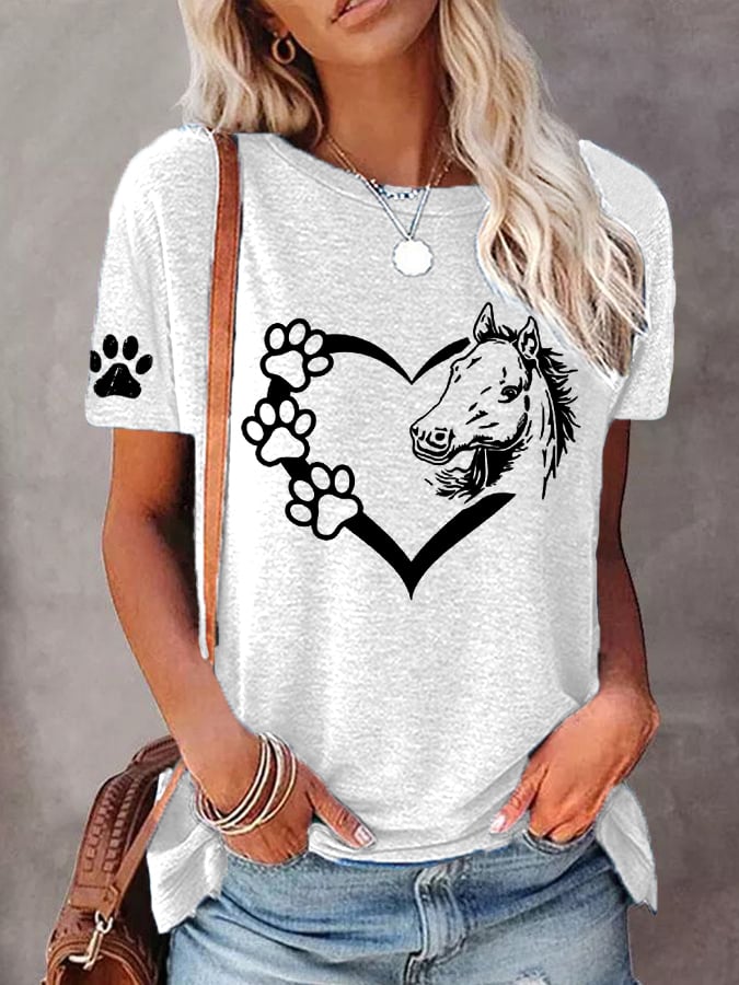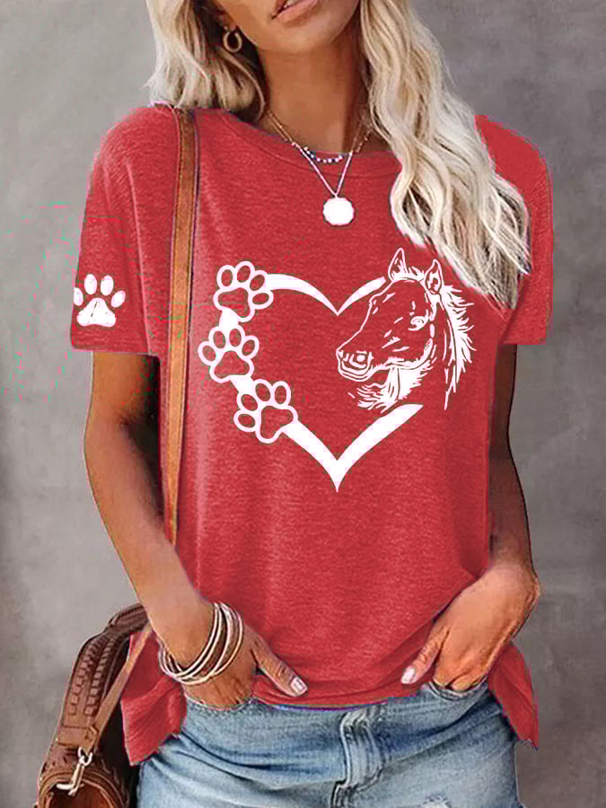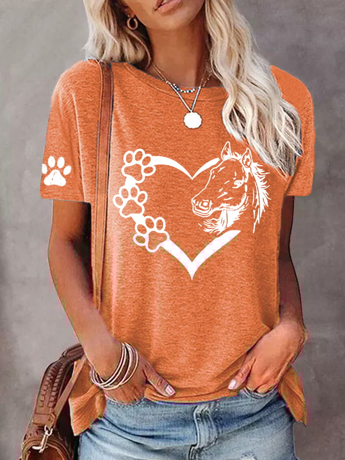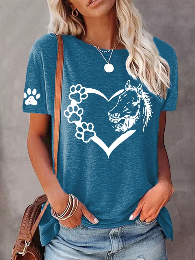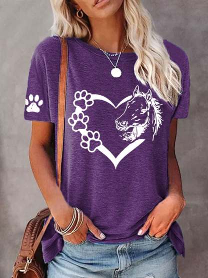 🐴Women's Dogs And Horses Love Heart Dog Lover Casual O-Neck Tee