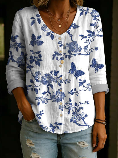 Women's Elegant Floral And Butterfly Decorative Patterns Linen And Cotton Shirt