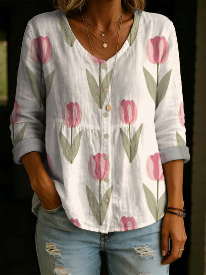 Women's Elegant Tulip Flower Decorative Pattern Linen And Cotton Shirt