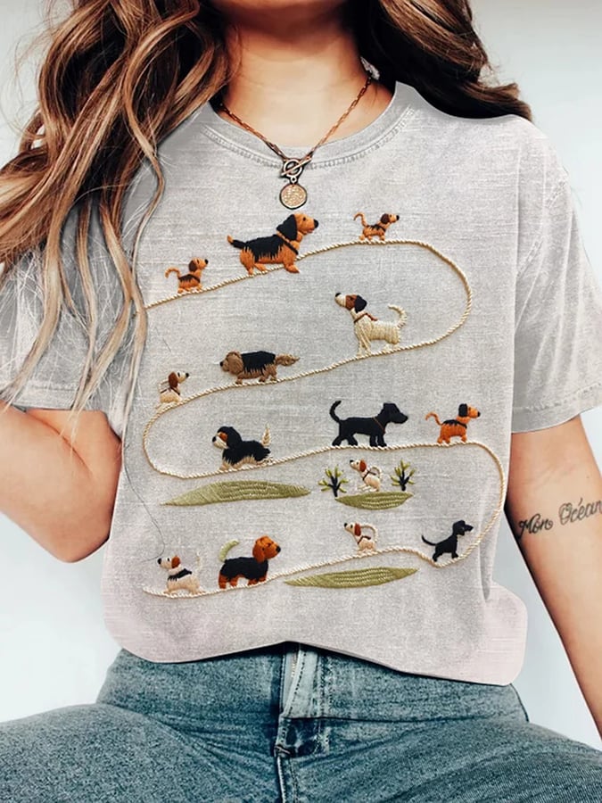 Women's Embroidered Dog Art Print T-shirt