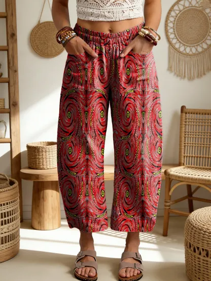 Women's Ethnic Art Print Elastic Waist Pocket Cotton Pants