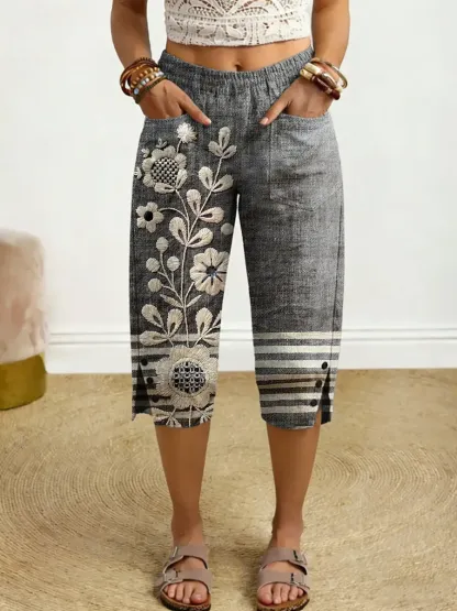 Women's Ethnic Floral Art Print Elastic Waist Cotton Pocket Pants