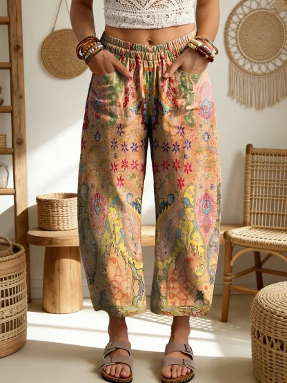 Women's Ethnic Floral Art Print Elastic Waist Pocket Cotton Pants – lolonb