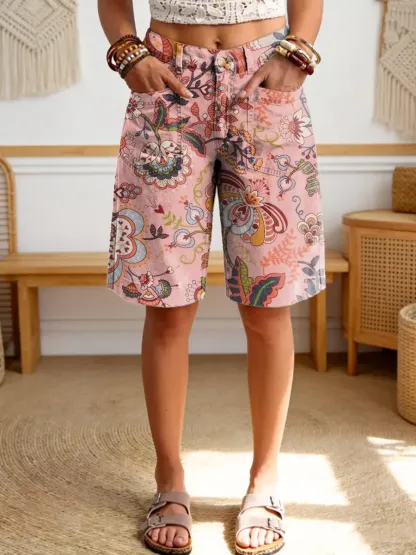 Women's Ethnic Floral Art Print Pocket Jeans
