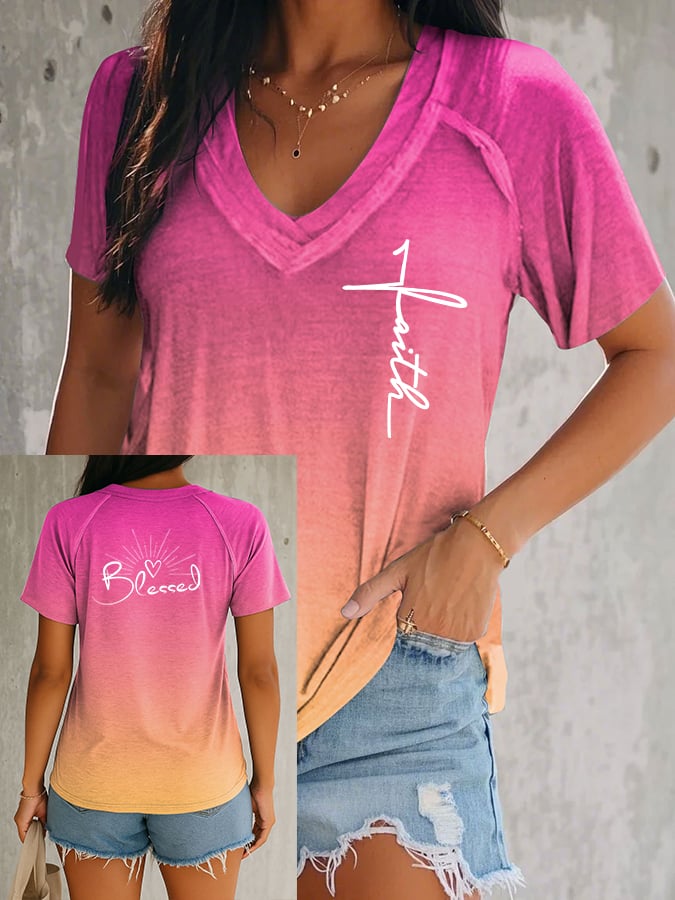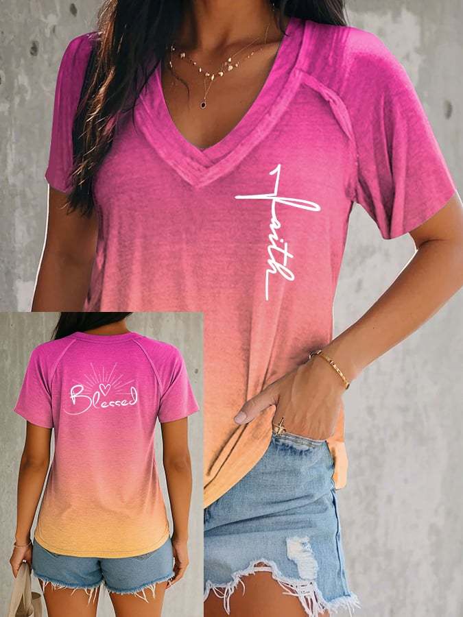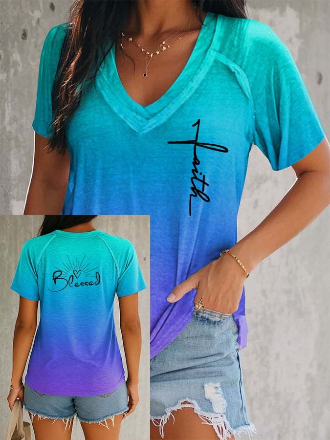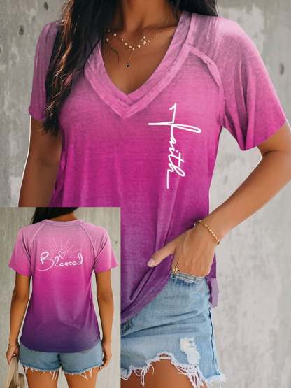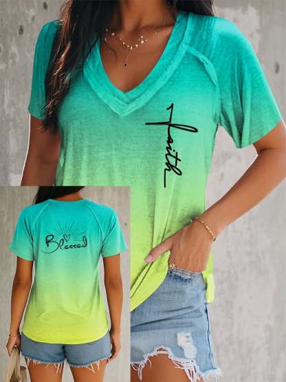 Women's Faith BLESSED Cross Gradient V-neck Short Sleeve