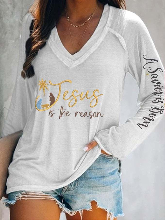 Women's Faith Jesus Is The Reason A Suvior Is Born Christian Printed V-Neck Long Sleeve T-Shirt