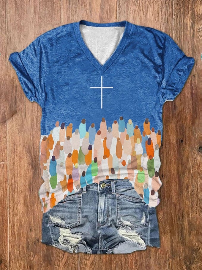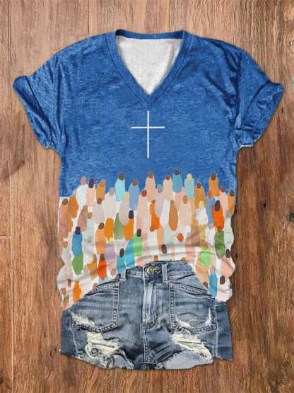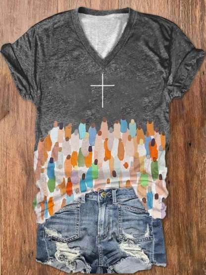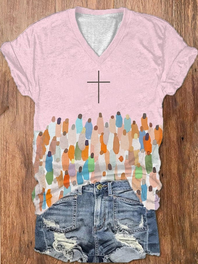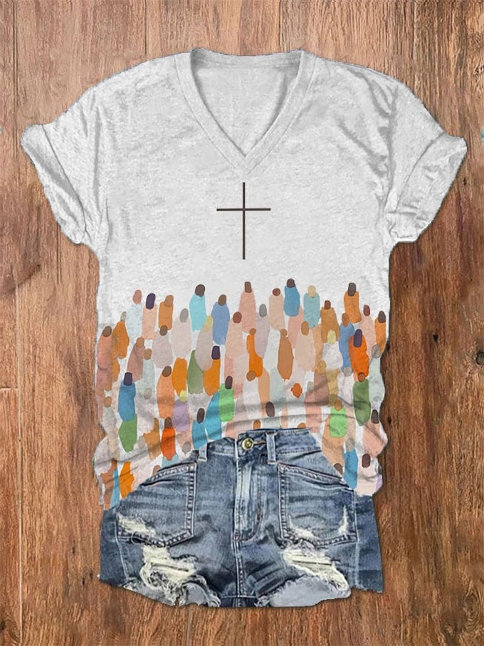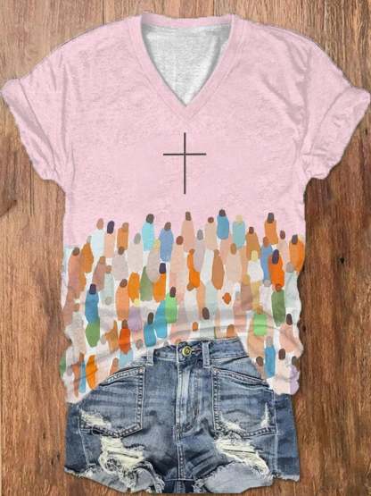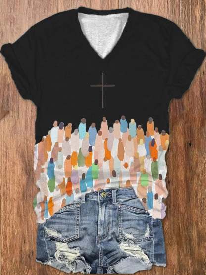 Women's Faith Respect Jesus Cross Print V-Neck T-Shirt