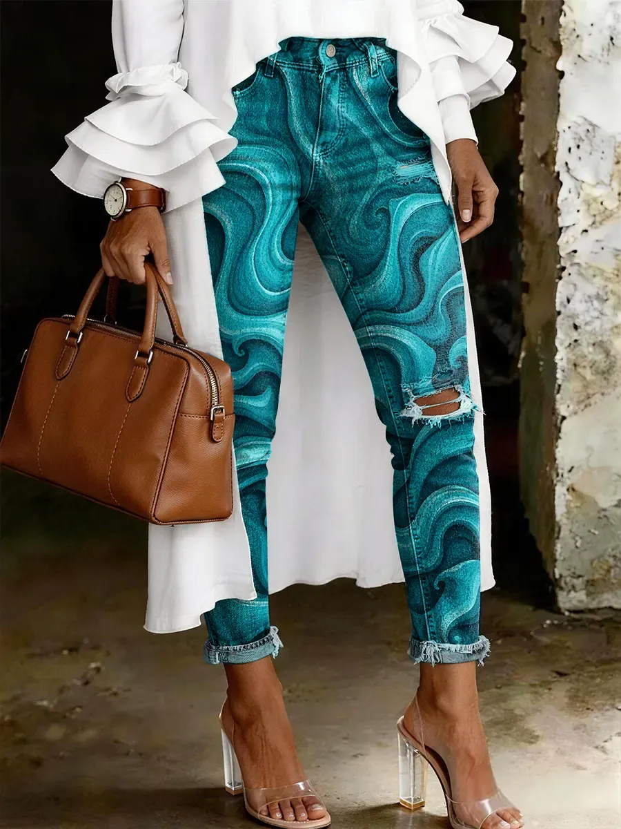 Women's Fashion Casual Art Print Ripped Skinny Jeans