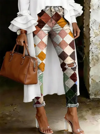 Women's Fashion Casual Diamond Pattern Print Ripped Skinny Jeans