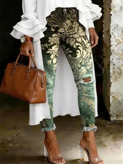 Women's Fashion Casual Flowers Art Print Ripped Skinny Jeans – lolonb