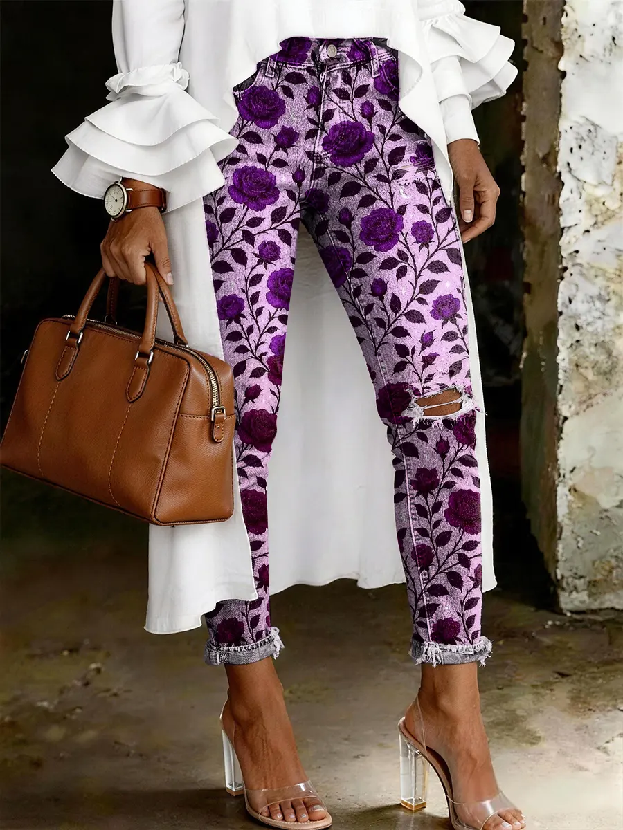 Women's Fashion Casual Flowers Art Print Ripped Skinny Jeans