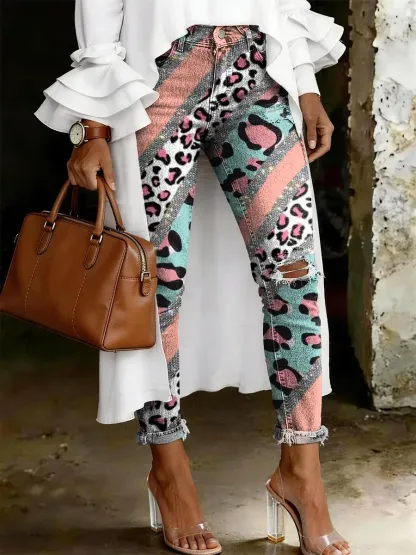 Women's Fashion Casual Leopard Art Print Ripped Skinny Jeans