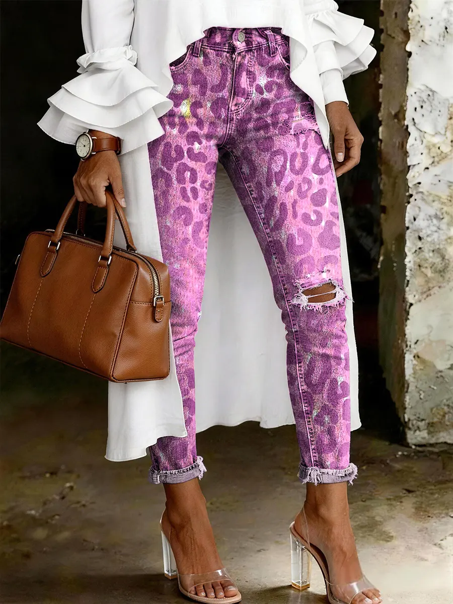 Women's Fashion Casual Leopard Art Print Ripped Skinny Jeans – lolonb