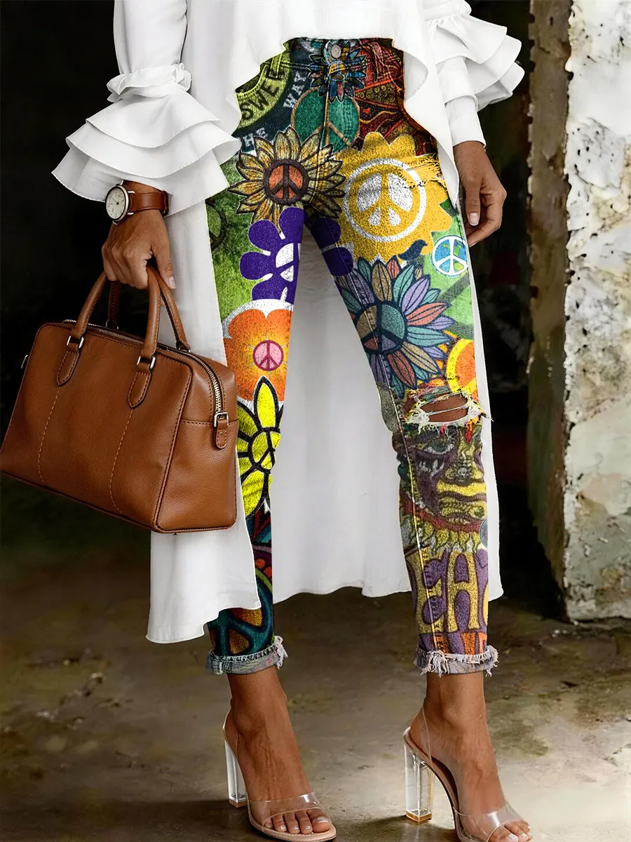 Women's Fashion Casual Multicolored Hippie Flowers Art Print Ripped Skinny Jeans