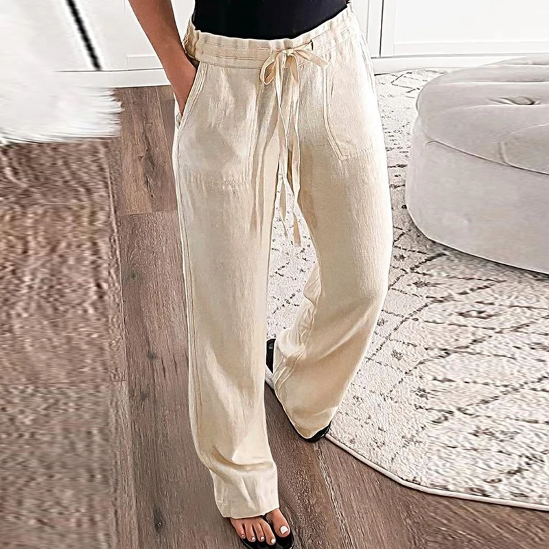 Women's Fashion Casual Simple Solid Color Breathable Drawstring Cotton Linen Trousers