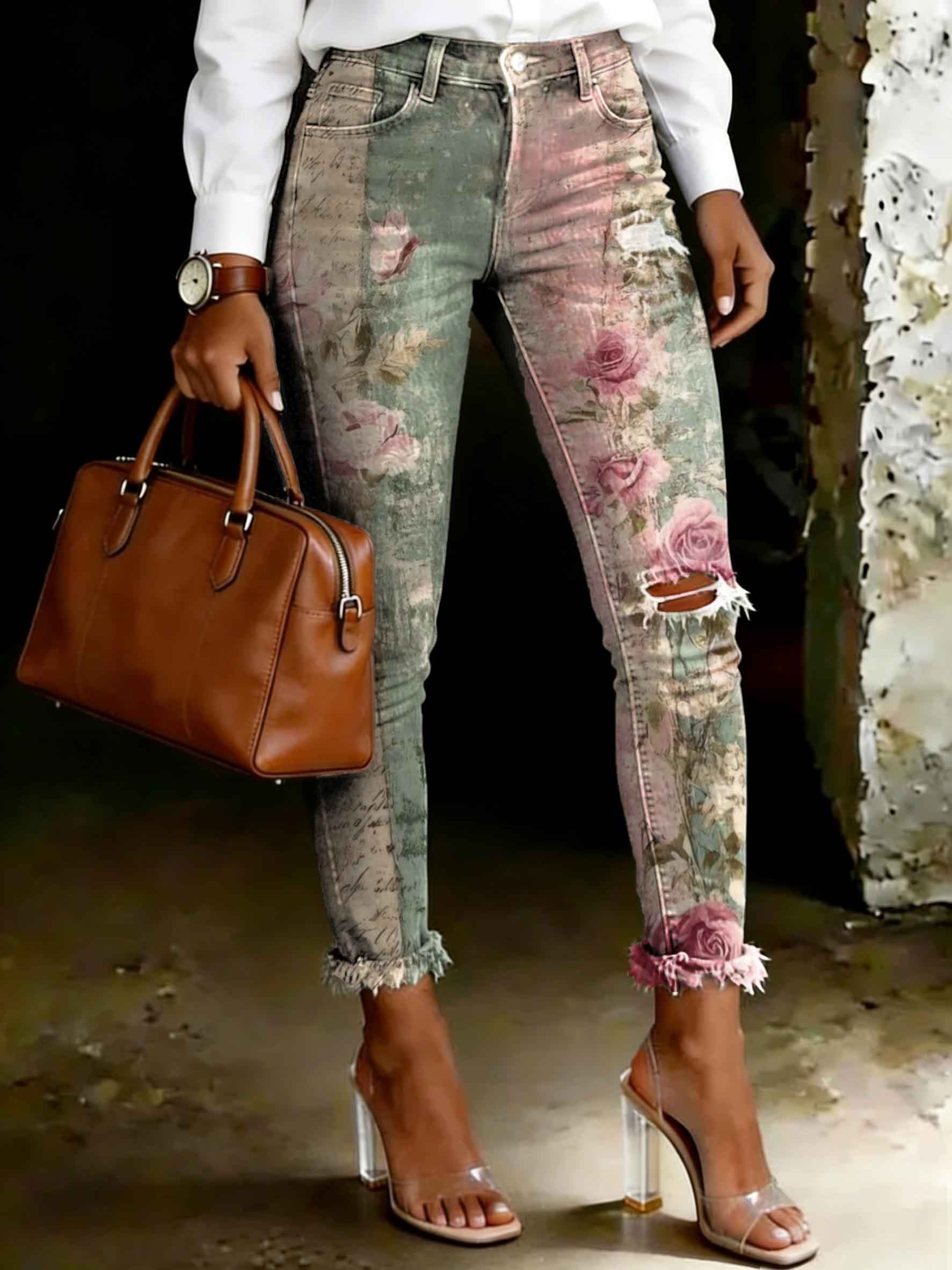 Women's Fashion Vintage Rose Stripes Print Ripped Skinny Jeans
