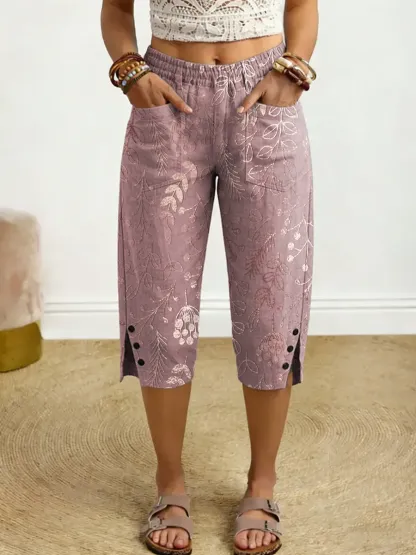 Women's Floral Art Print Elastic Waist Cotton Pocket Pants