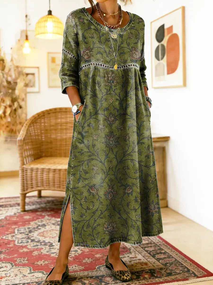 Women's Floral Art Print Round Neck Hollow-out Denim Dress