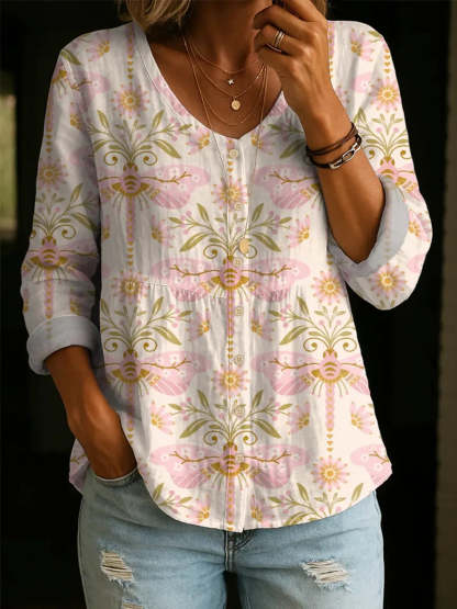 Women's Floral Dragonfly Pattern Art Print Casual Cotton Shirt