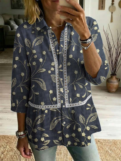 Women's Flower Art Print Casual Lapel Cotton Shirt