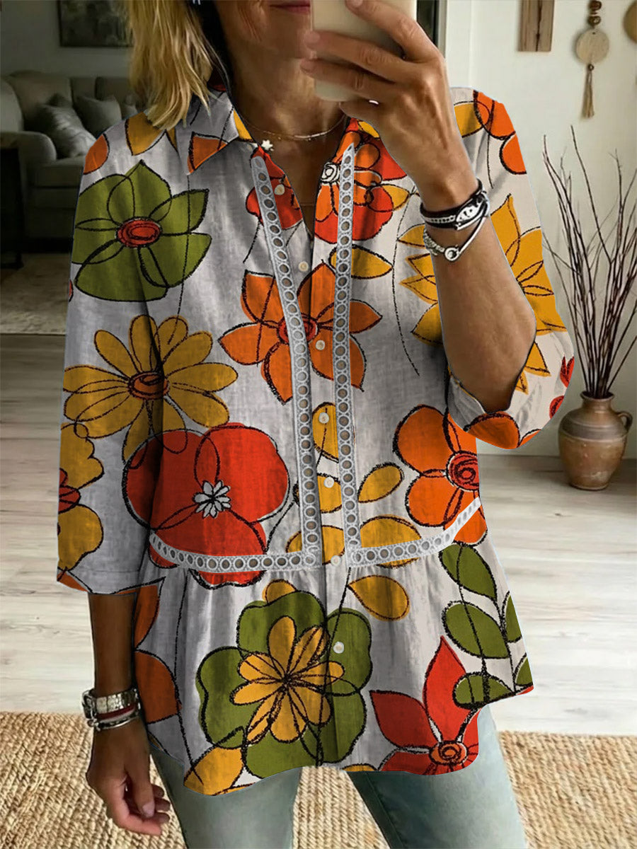 Women's Flower Art Print Casual Lapel Cotton Shirt – lolonb