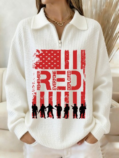 Women's Friday Let's Wear Red Remember All Veterans Print Waffle Lapel Top