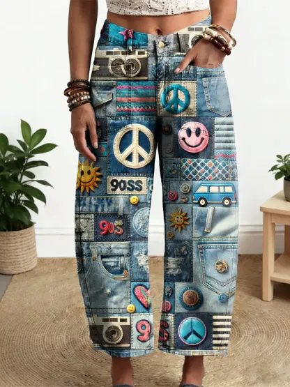 Women's Hippie Style Pattern Art Print Casual Cotton Denim Pants