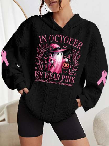 Women's In October We Wear Pink Halloween Ghost Breast Cancer Awareness Warrior Cable Hoodie