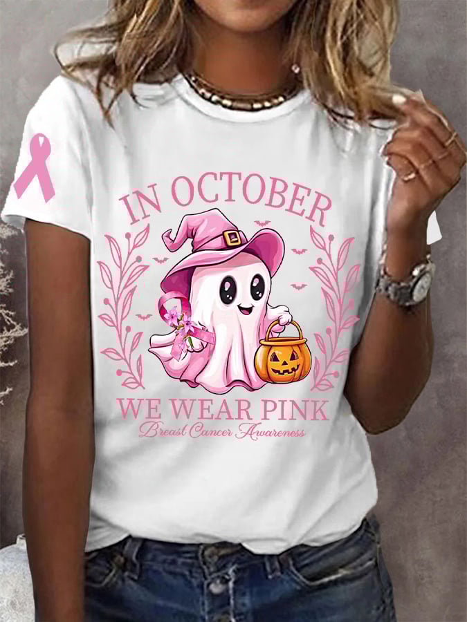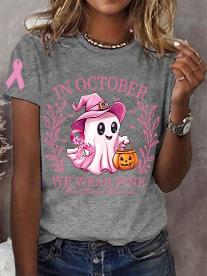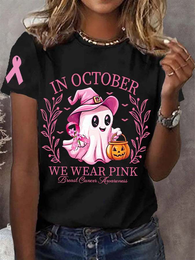 Women's In October We Wear Pink Halloween Ghost Breast Cancer Awareness Warrior Tee