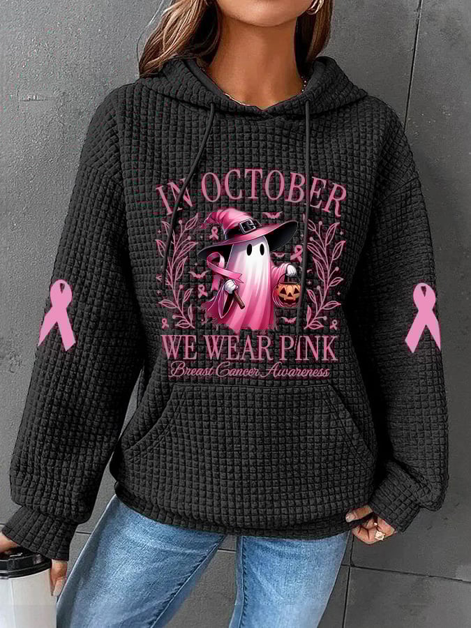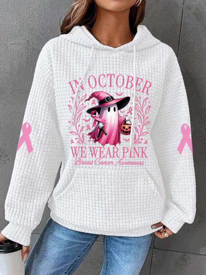 Women's In October We Wear Pink Halloween Ghost Breast Cancer Awareness Warrior Waffle Hoodie