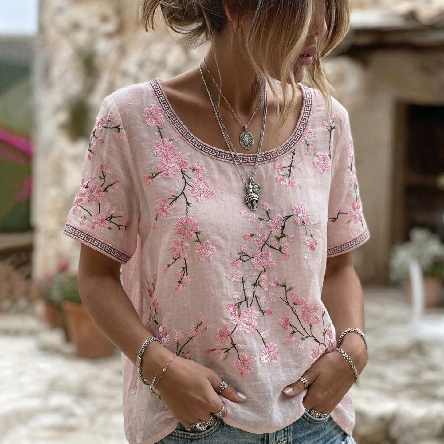 Women's Japanese Cherry Blossom Art Round Neck Short Sleeve T-shirt
