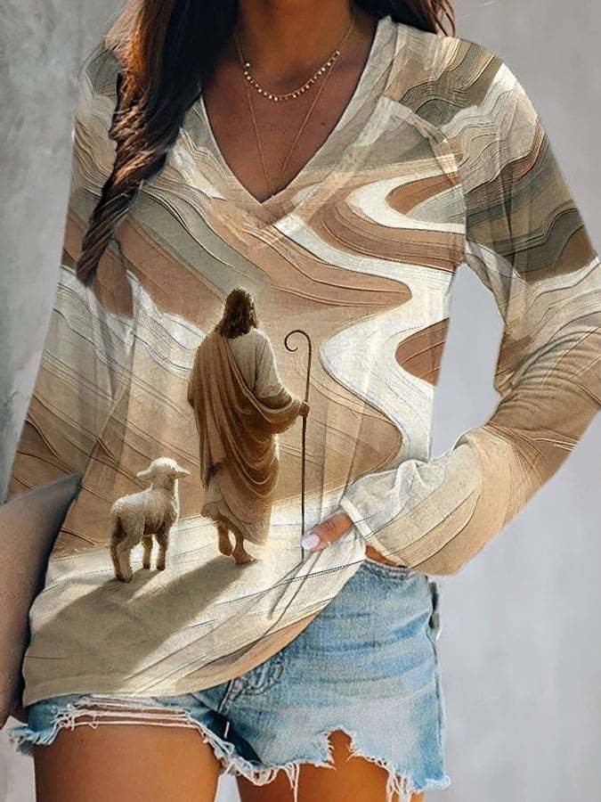 Women's Jesus and Lamb Print V-Neck T-Shirt
