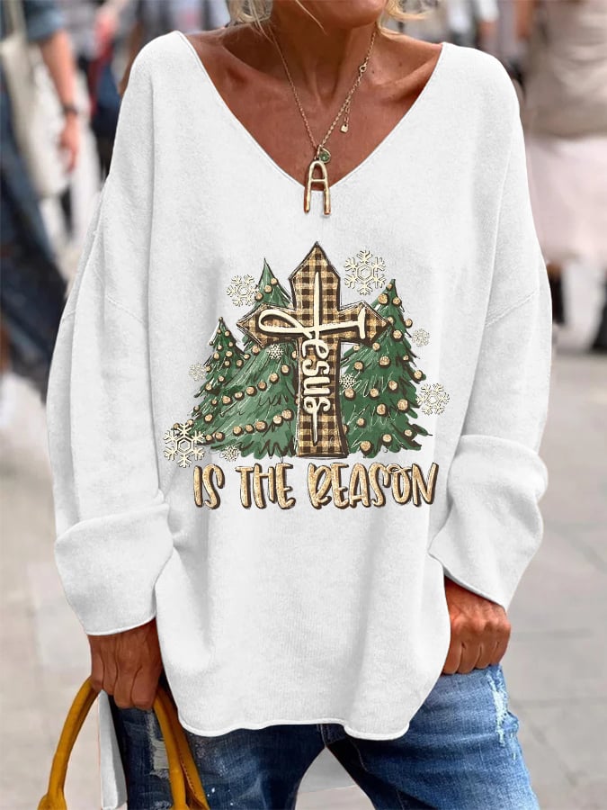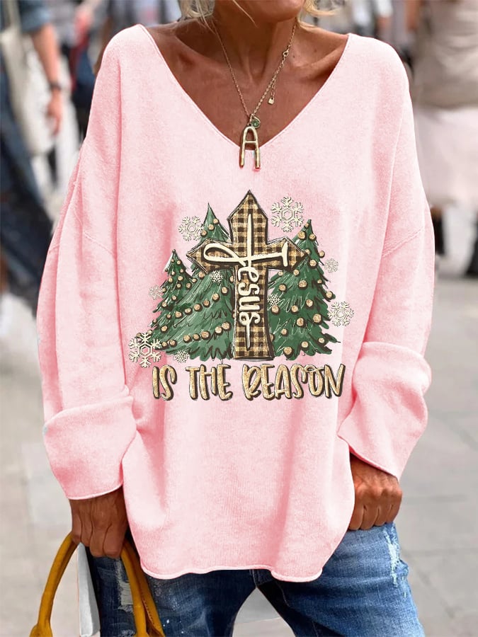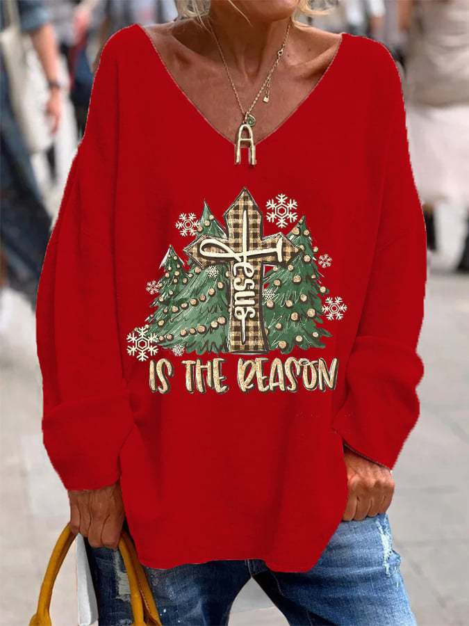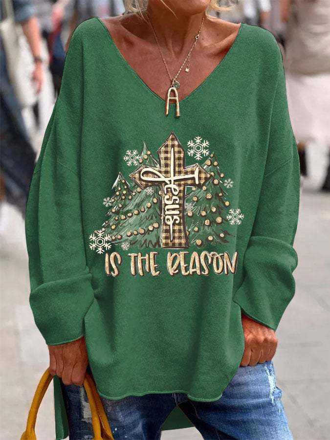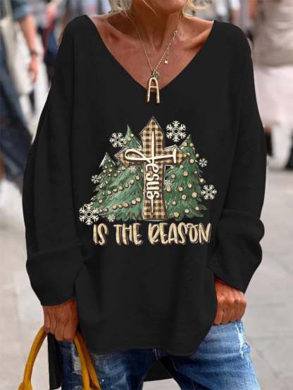 Women's Jesus is the reason Cross Christmas Tree Printed Casual V-Neck Top