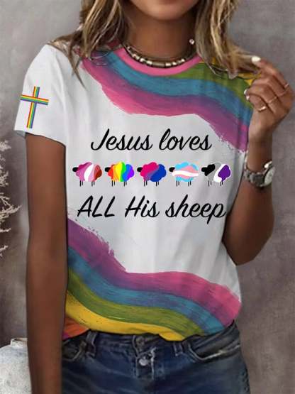 Women's Jesus Love All His Sheep Print Short Sleeve Casual T-Shirt