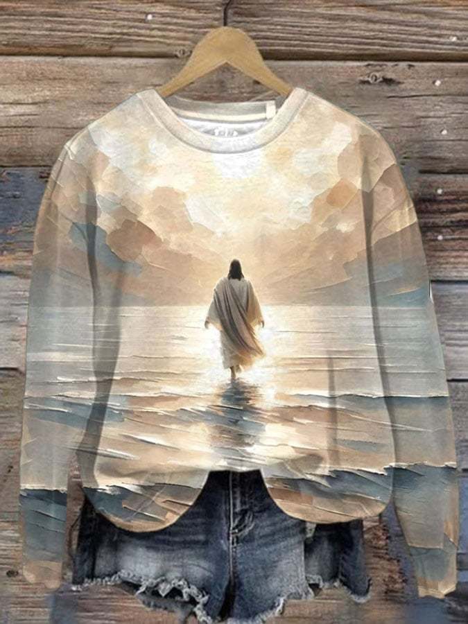 Women's Jesus Walking On Water Print Round Neck Sweatshirt