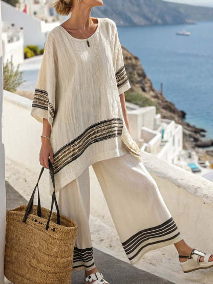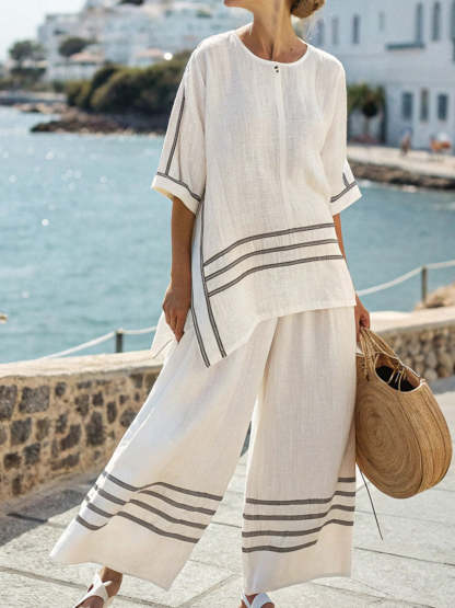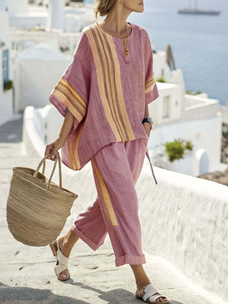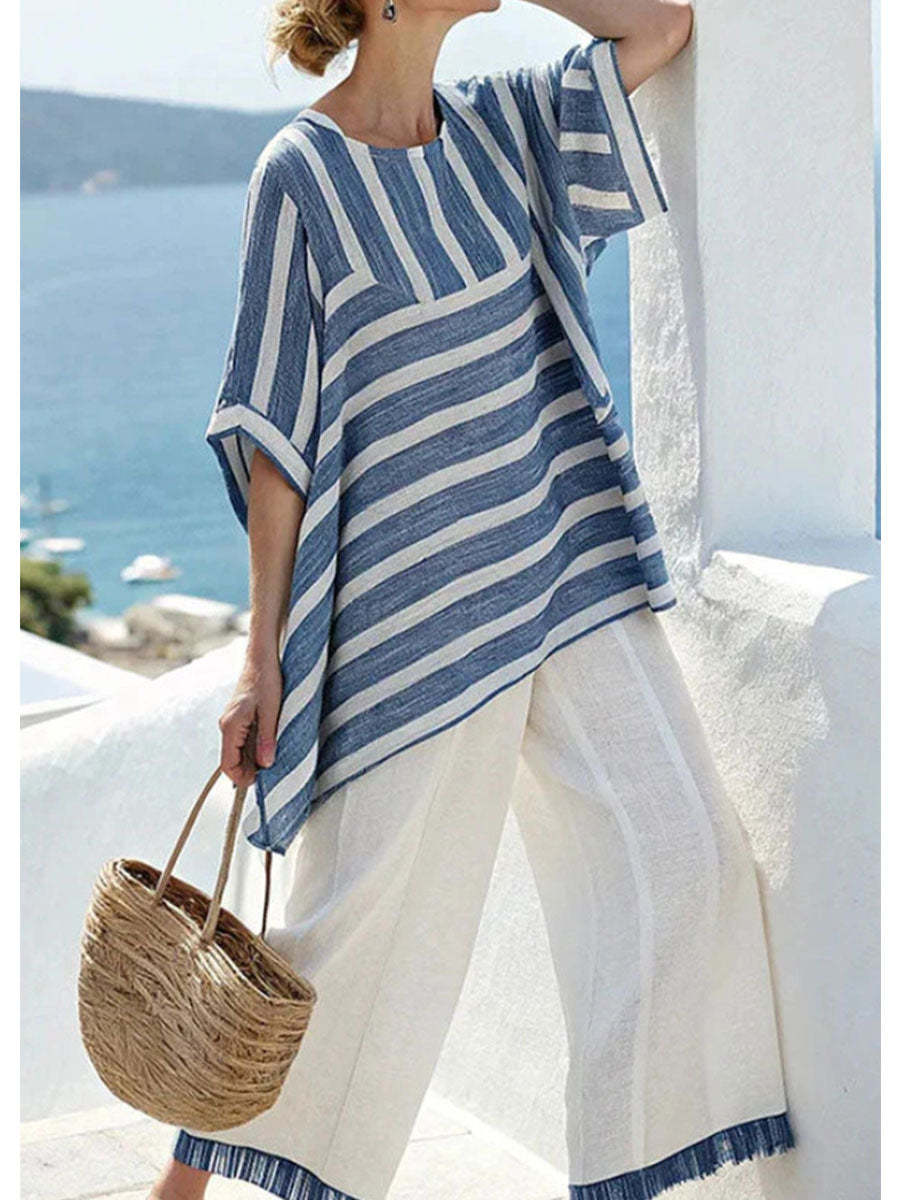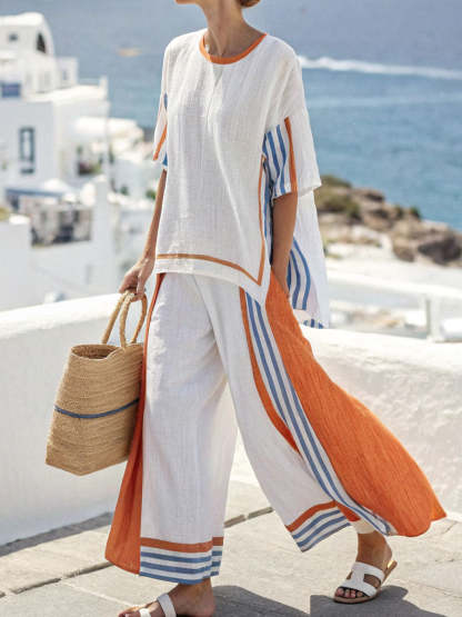 Women's Loose-fitting Casual Versatile Color-blocked Round Neck Flutter Sleeve Shirt Set