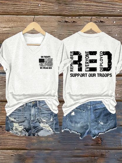 Women's On Fridays We Wear RED Remember Everyone Deployed Print V Neck T-shirt